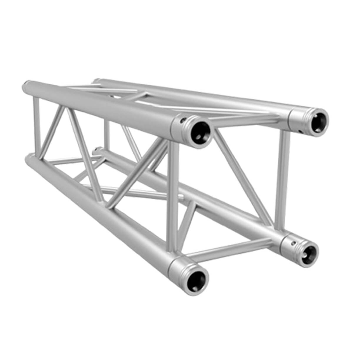 This 1 m F34 truss segment is precisely engineered for professional event and installation use. Constructed from EN-AW 6082-T6 aluminium alloy with main tubes of 50 mm diameter and wall thickness of 2 mm, and braces of 20 mm diameter and 2 mm wall thickness, it meets the F34 specification for strength and rigging performance. The 290 mm outer dimension square profile allows compatibility with standard F34 4-point systems and quick-connect conical couplers. Whether you’re rigging lighting fixtures, housing trusses or building totems and towers, this segment offers precise length, versatility and durability. It’s ready for rental, touring, exhibition or fixed installation — all with a clean silver finish.