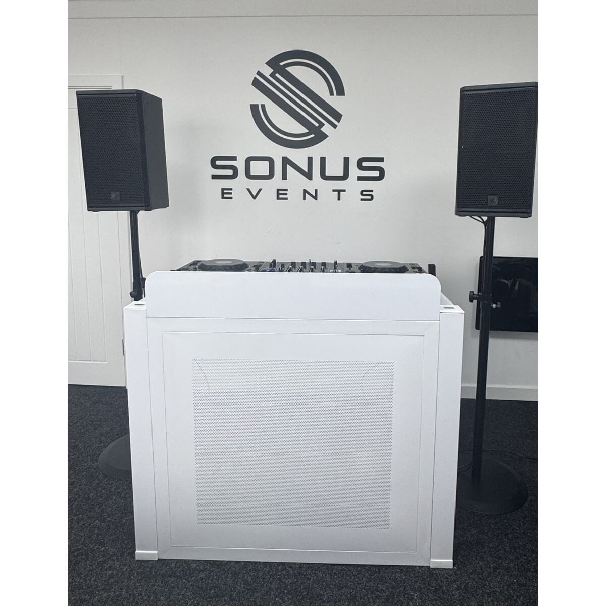 The Premier DJ Booth combines sleek design with practical functionality — foldable, lightweight, and perfect for weddings, corporate events, and parties. With a satin white finish and mesh front panel for creative back-lighting, it brings a clean, professional look to any venue. The vented metal shelf with cable cutouts keeps your setup organised, while fully height and tilt-adjustable top shelves allow a flexible two-tier configuration for your DJ gear. Designed for quick assembly and effortless transport, the Premier DJ Booth includes carry bags for easy setup and pack-down, making it an ideal choice for mobile DJs who want a stylish, reliable, and event-ready workstation that enhances every performance.